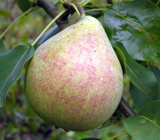 Плоды среднего размера по форме округло-конические, весом 120-160 гр. Мякоть кремового цвета, мелкозернистая, сочная, сладкая с нежным грушевым ароматом. На вкус плоды сладкие и сочные.Храниться без потерь своих вкусовых качеств могут 2 месяца в прохладно